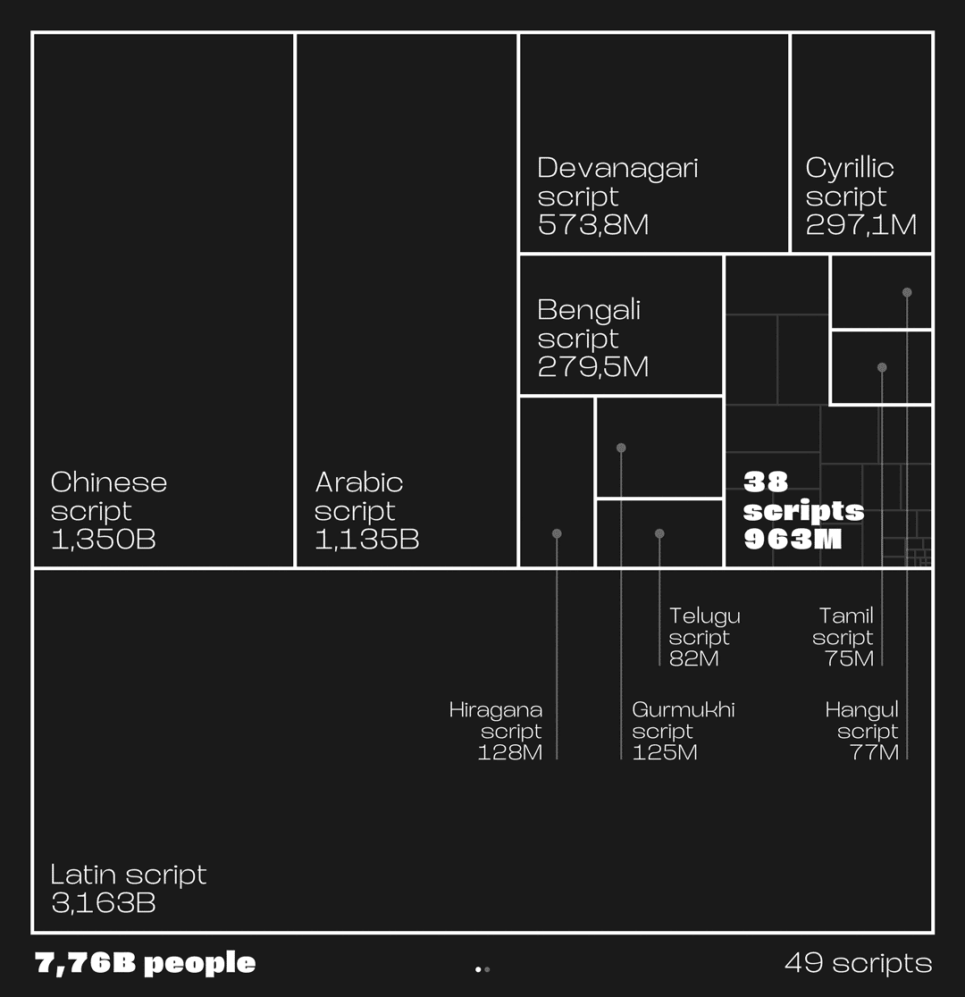 My perception of the type world is for sure biased. I see too few non-Latin scripts releases in my social media echo chamber (I need to work on that). To get a representation of the scripts distribution, I’ve created a visualisation of both the population and their scripts on one slide. And the number of languages in those scripts on the other slide.